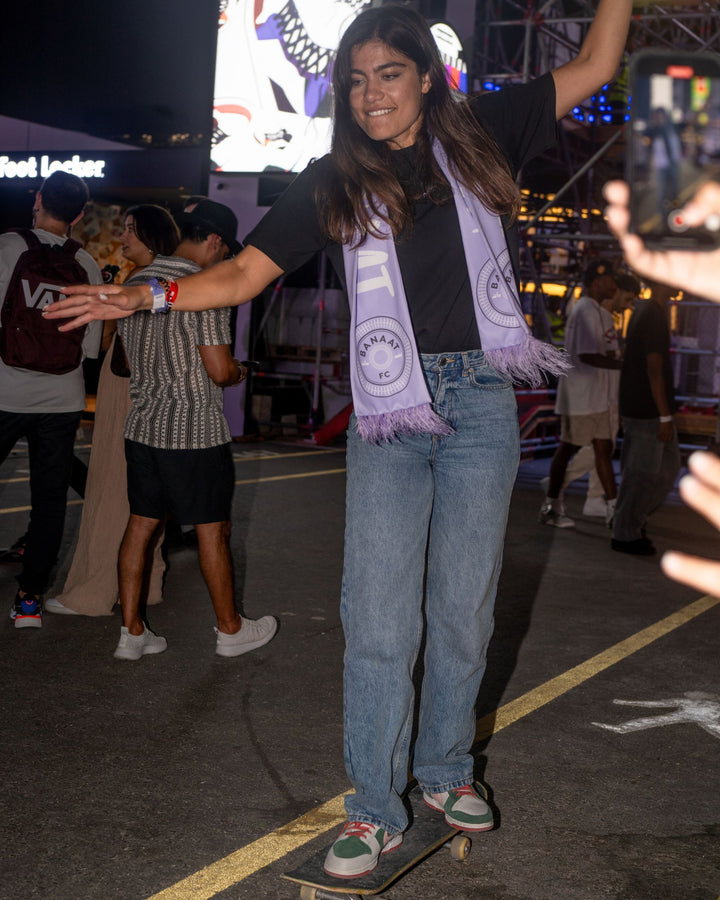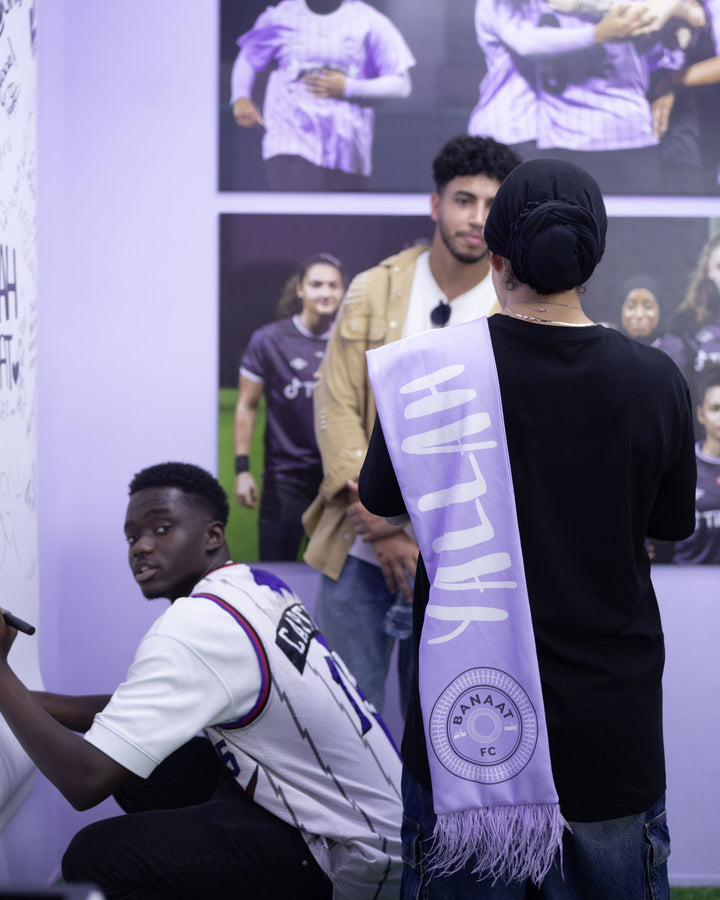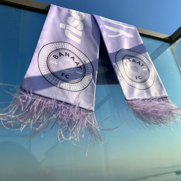 Support your local women's football club and elevate your look with the BFC Feather Scarf in lilac. Made from polyester and featuring feather ends, this scarf proudly displays the club slogan "Rise. Represent. Reclaim," on a side and the iconic #yallahbanaat on the other side along with Banaat FC logo.